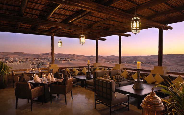 Three hours from downtown Dubai, this resort sits in the world’s largest stretch of uninterrupted sand desert—the perfect place for a sunset camel trek. From the back of one of these magnificent animals, you’ll watch the dunes light up in amber and gold tones, stopping at the most picture-perfect hour for refreshments. For a more relaxing experience, dine at the resort’s upscale Suhail restaurant, where plush armchairs face the night sky.