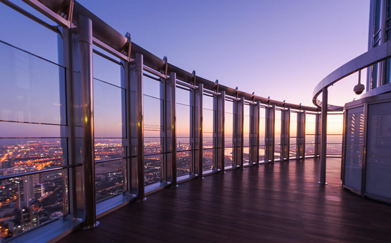 Out in the desert, the sun slips behind sand dunes, where it blasts bright orange and gold for a few minutes before disappearing. Over the sparkling azure waters of the Arabian Gulf, silhouettes of soft clouds glow purple and pink as the sun sinks into the horizon. And from the world’s tallest building, the view of the sunset is like nowhere else on earth.