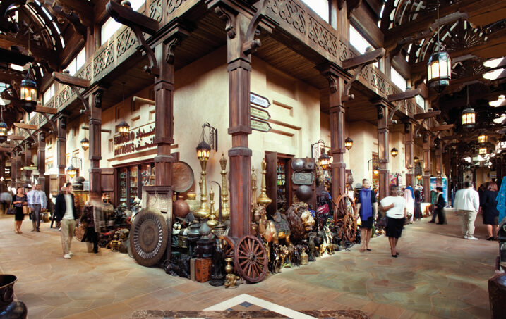 The stalls at this souk offer a bit of everything. After visiting merchants trading in souvenirs, art, and more, tuck in at one of the more than 40 eateries featuring an international variety of food. Not hungry? Feast your eyes, instead, on the beauty of this bustling bazaar. A faithful recreation of an ancient marketplace, this striking space is rich in stunning details, including the elaborate Arabic architectural design that allows bursts of sunlight to peek through intricate carvings in wooden archways.